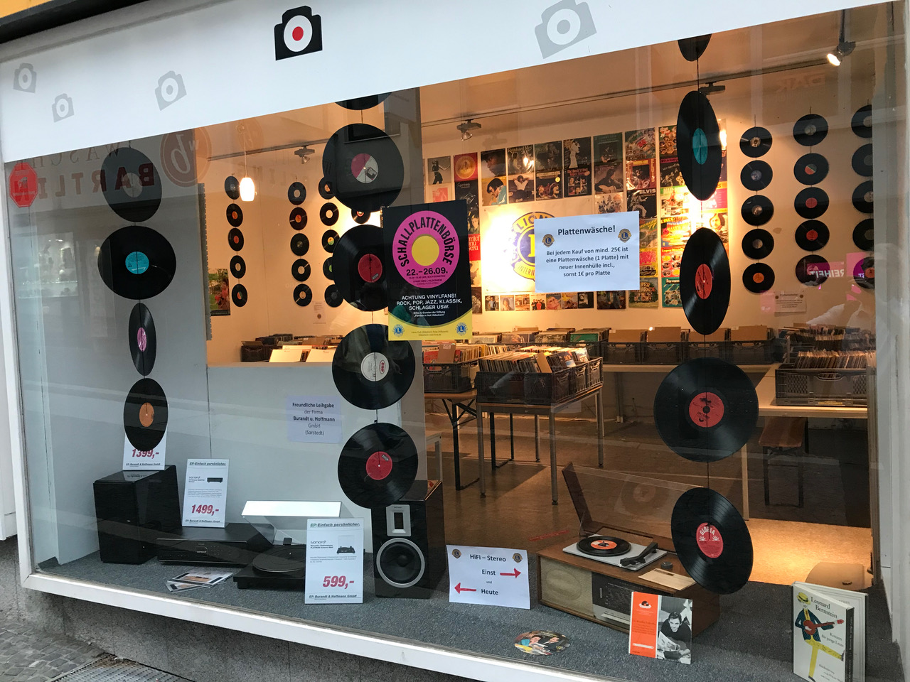Nach Übernahme des Verkaufsladens von der Vornutzerin haben wir ihn innerhalb von vier Tagen mit alten und neuen Plattenspielern, Schallplatten, Infos zum Spendenempfänger und Lionsplakaten dekoriert. Bereits eine halbe Stunde vor der Eröffnung am Morgen des 22. September bildete sich eine Schlange von Interessierten vor dem Geschäft und nach der Öffnung „stürmten“ Vinylliebhaber förmlich die Räume.