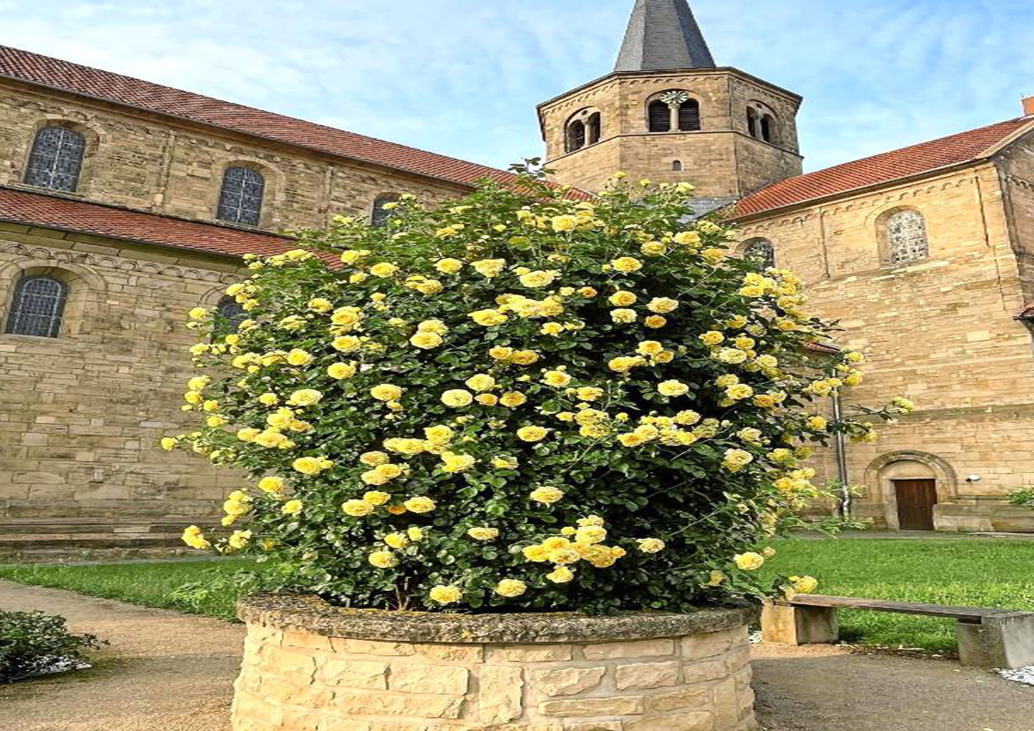 Auf diesem Foto steht der vom Lions Club Hildesheim-Rose 2017 wieder errichtete und mit vier Rosenbüschen geschmückte Brunnen auf der zur Westseite offenen Innenhoffläche zwischen der Basilika St. Godehard und der Hochschule für Rechtspflege in voller Blüte. Der Lions Club hatte den Brunnen, der auf alten Zeichnungen von St. Godehard vorhanden war, anlässlich des hundertjährigen Bestehens von Lions International auf städtischem Grund errichtet und pflegt ihn seitdem. Zum Verweilen dort sind auch zwei Bänke aufgestellt worden. „Das Ensemble von Basilika, offenem Innenhof und blumenberanktem statt wasserführenden Brunnen lädt zum Ausruhen und Tagträumen ein,“ beschreibt Georg Teyssen vom Lions Club Hildesheim-Rose die entspannende Atmosphäre dort.
